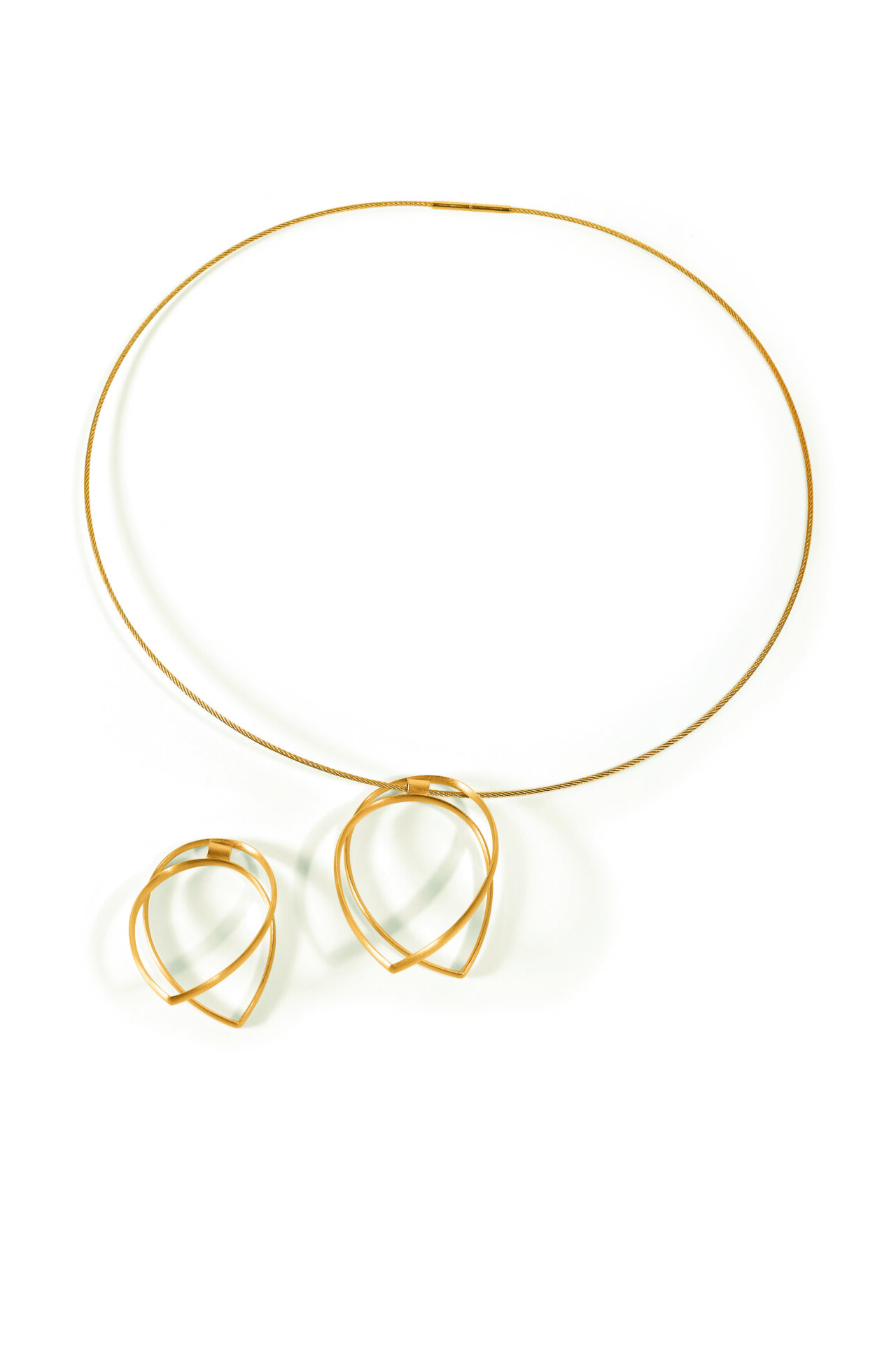Jeweils zwei Blätter- oder Tropfenformen aus einem fortlaufenden Draht – diese Schmuckstücke sind schlicht und edel, zeitlos und elegant. Die besondere Spannung entsteht, weil ein Teil der Form in den Raum hineinragt und so sein eigenes Volumen beansprucht.