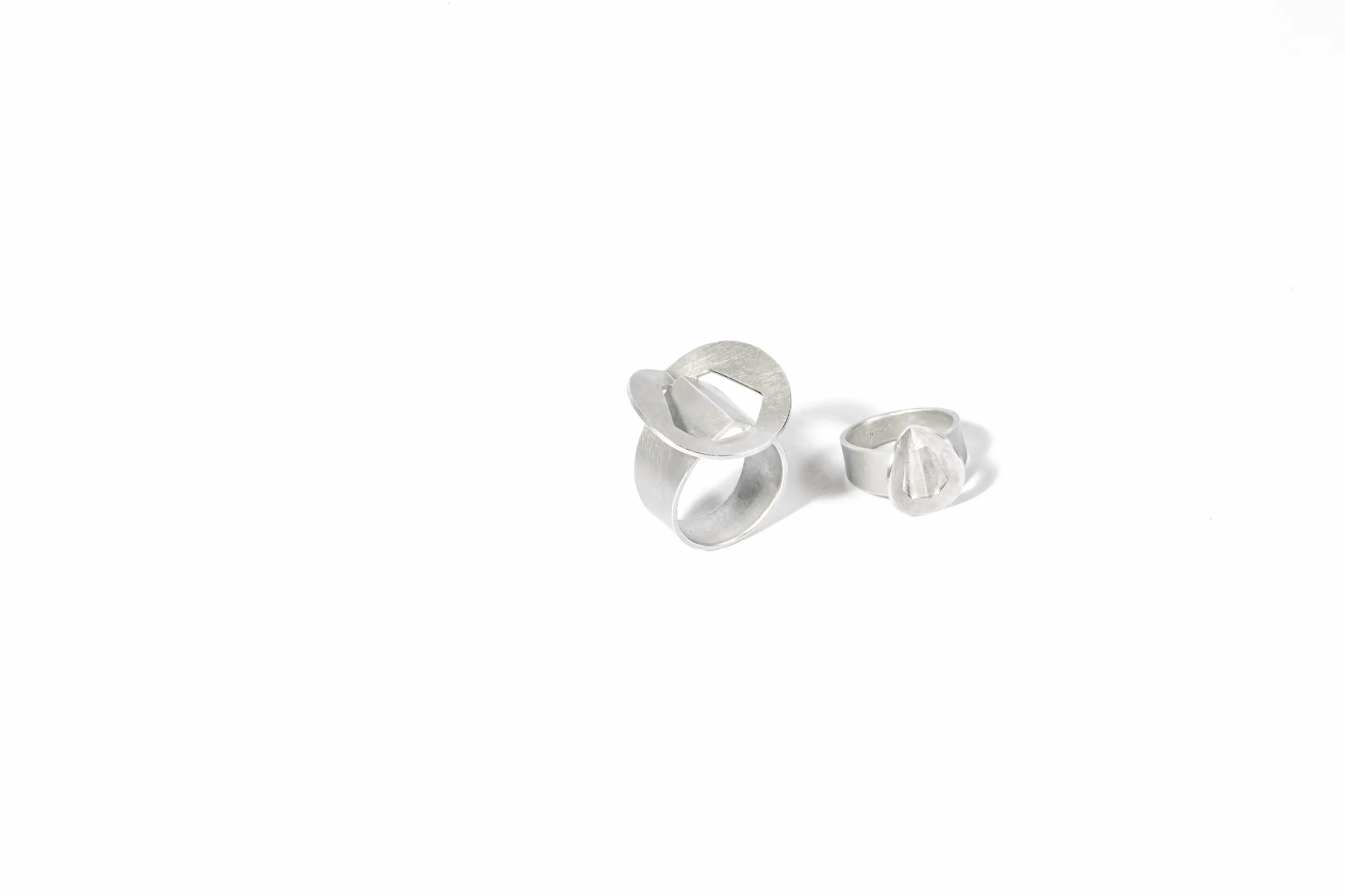 Der bauchige Tropfen ist umschlossen von einem gradlinigen Sechseck – er fällt aus ihm heraus, wird eigenständig und umschließt dabei abermals ein Sechseck. Es entstehen dadurch zwei Schmuckstücke, die sich ineinander widerspiegeln, das Innere ist im Äußeren zu finden, und umgekehrt. So wie die Stücke zueinanderpassen, passen auch die Formen perfekt zueinander. Ihr Gegensatz liegt in dem Widerspruch von kantigen und runden, doch die Harmonie liegt: in der zarten Figut.