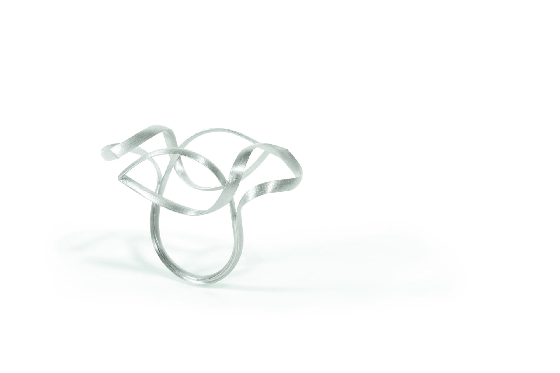 Wie kleine Bäumchen oder Pflanzensprösslinge scheinen diese Schmuckstücke dynamisch schwebend in den Raum zu wachsen. Durch den Navettedraht und die geschwungene Linienführung sind edle, volumenreiche Formen entstanden, die zu luftig leichten und dennoch auffälligen Ohrringen, Ringen und Ketten vollendet wurden.