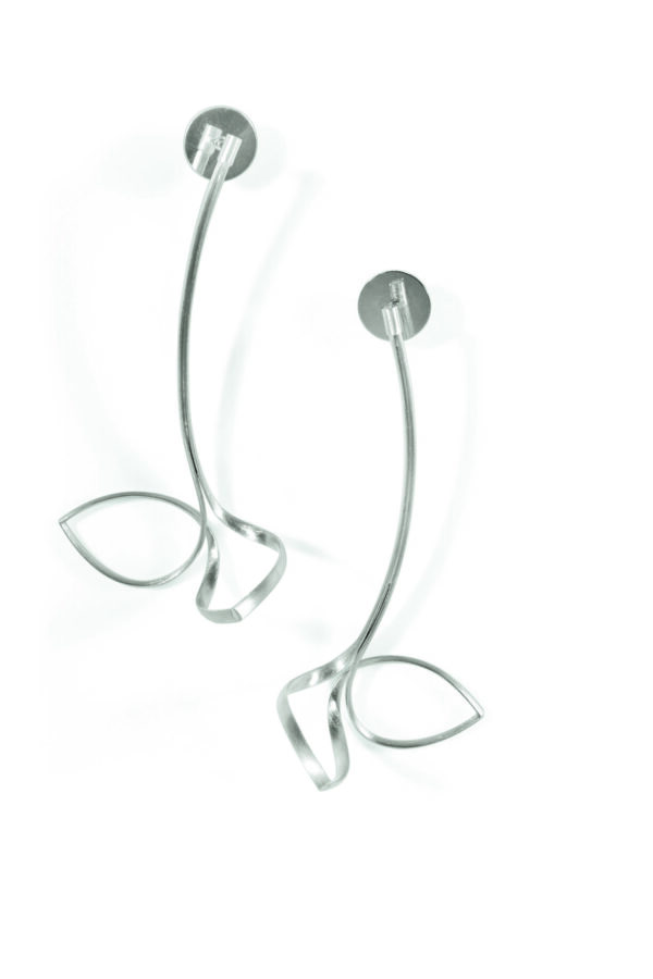 Wie kleine Bäumchen oder Pflanzensprösslinge scheinen diese Schmuckstücke dynamisch schwebend in den Raum zu wachsen. Durch den Navettedraht und die geschwungene Linienführung sind edle, volumenreiche Formen entstanden, die zu luftig leichten und dennoch auffälligen Ohrringen, Ringen und Ketten vollendet wurden.